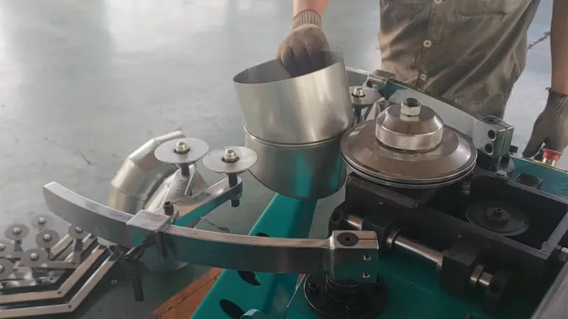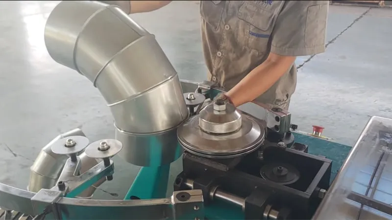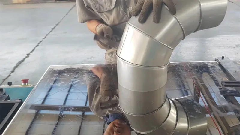 Станок HRE-1250 соединяет в колено секции трубы, формируя замковый шов и плотно прижимая его, чтобы воздуховод был герметичным и прочным.
